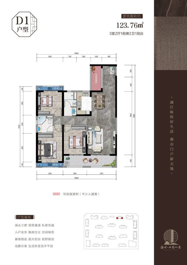 出则繁华,近享宜家,十园八景位于满江核心商业圈,出门即达,相近而不相临,享繁华商圈内仅有纯住宅高品质公园小区。(相近而不相临,唯有十园八景不会因小区和商业相临而堵车、也不会因各种各样的噪音而烦恼,同时购物、逛商场只需步行)。