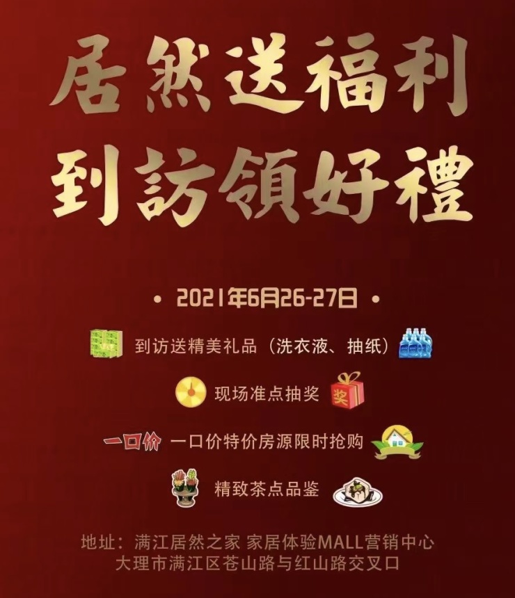 据搜狐焦点大理站获悉,大理居然之家,居然送福利,到访领好礼。6月26日-6月27日,到访送精美礼品、现场准点抽奖、一口价特价房源限时抢购、精致茶点品鉴!