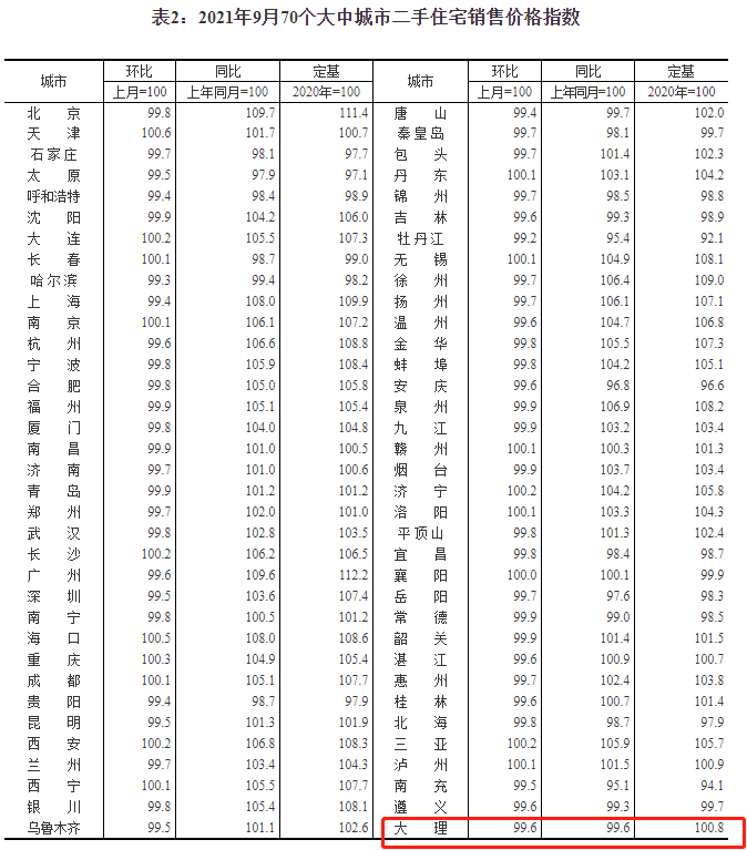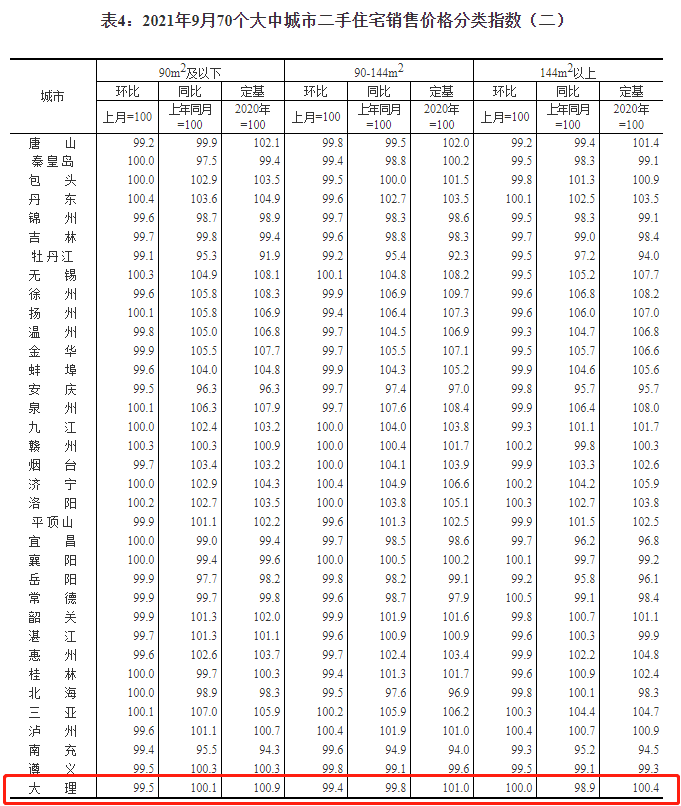 从公布的数据来看,大理市2021年9月新建商品住宅销售价格,环比下跌0.5%,同比下跌2.4%;二手住宅销售价格,环比下跌0.4%,同比下跌0.4%。