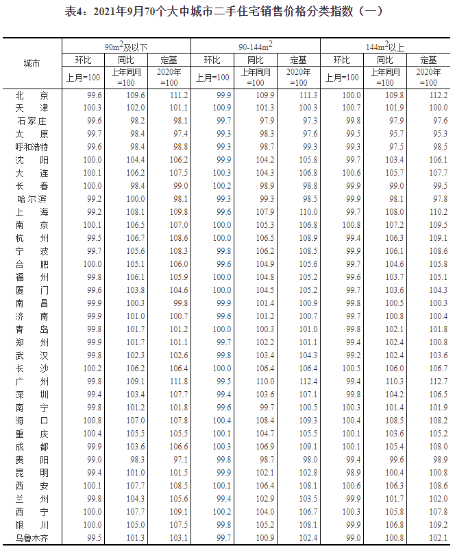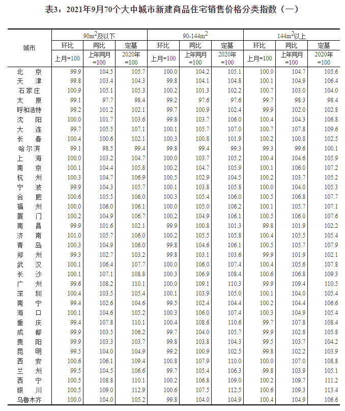 2021年10月20日,国家统计局对外公布2021年9月份70个大中城市商品住宅销售价格变动情况。