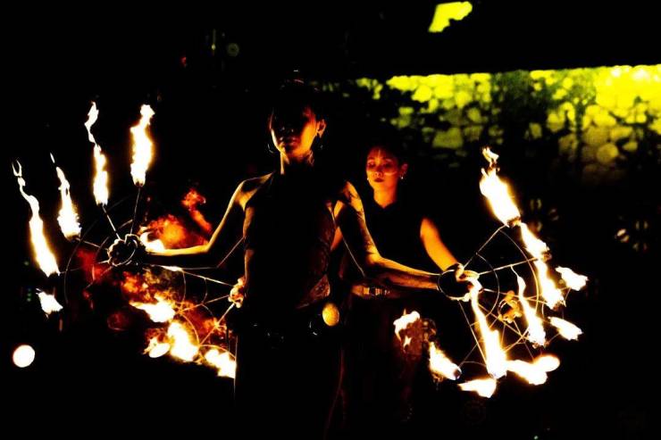 火舞表演不仅有“铁树银花”的美丽,还有“百家安宁”的祝福,表演者的身影在火光的映照下忽隐忽现,动感、热烈又神秘。火舞翻飞,烈焰驱邪,邪氛尽消散!