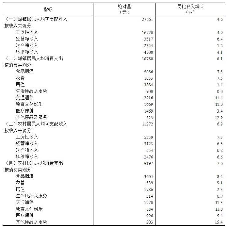 上半年,全国居民人均可支配收入20733元,比上年同期名义增长5.4%,扣除价格因素,实际增长5.3%。分城乡看,城镇居民人均可支配收入27561元,增长(以下如无特别说明,均为同比名义增长)4.6%,扣除价格因素,实际增长4.5%;农村居民人均可支配收入11272元,增长6.8%,扣除价格因素,实际增长6.6%。