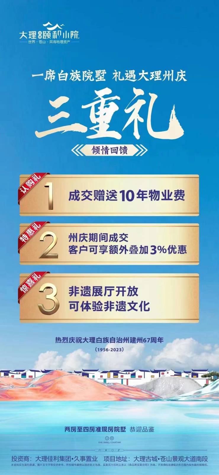 大理古城·颐和小院,一席白族院墅,礼遇大理州庆,三重礼倾情回馈!关注大理古城·颐和小院的朋友可前往售楼处现场看房,咨询房源信息请拨打电话400-156-0036