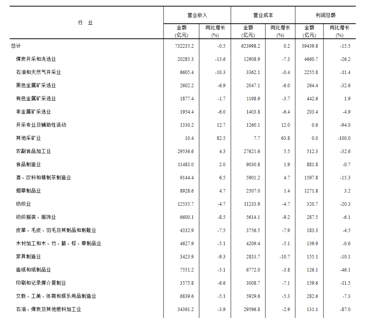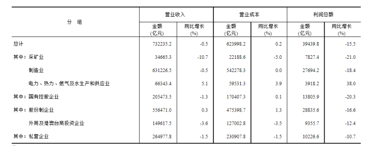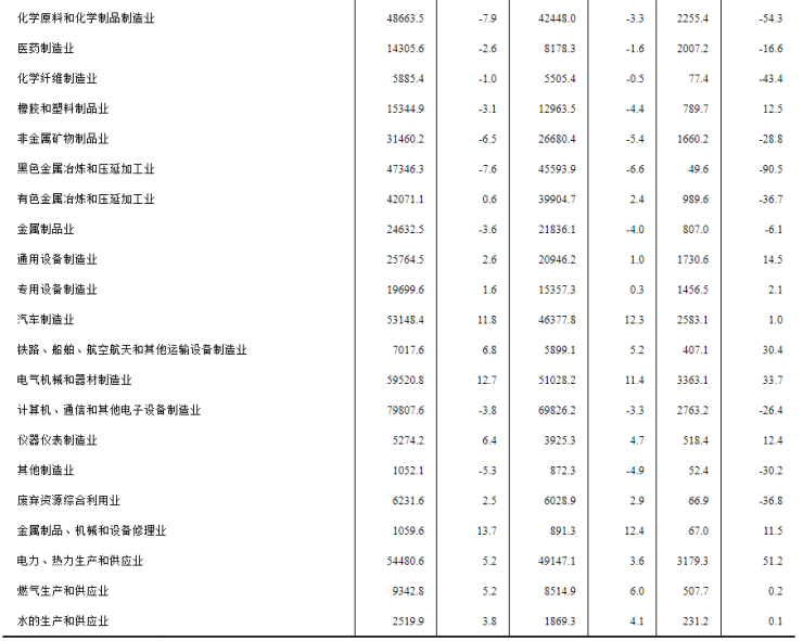 二、规模以上工业企业利润总额、营业收入等指标的增速均按可比口径计算。报告期数据与上年所公布的同指标数据之间有不可比因素,不能直接相比计算增速。其主要原因是:(一)根据统计制度,每年定期对规模以上工业企业调查范围进行调整。每年有部分企业达到规模标准纳入调查范围,也有部分企业因规模变小而退出调查范围,还有新建投产企业、破产、注(吊)销企业等变化。(二)加强统计执法,对统计执法检查中发现的不符合规模以上工业统计要求的企业进行了清理,对相关基数依规进行了修正。(三)加强数据质量管理,剔除跨地区、跨行业重复统计数据。