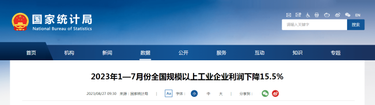 2023年1—7月份全国规模以上工业企业利润下降15.5%