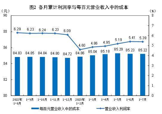 1—7月份,规模以上工业企业每百元营业收入中的成本为85.22元,同比增加0.62元;每百元营业收入中的费用为8.37元,同比增加0.30元。