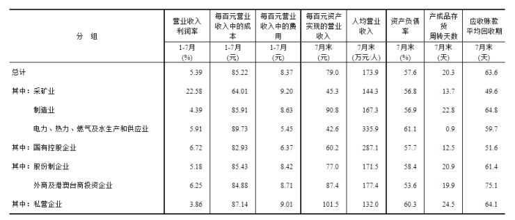 7月末,规模以上工业企业每百元资产实现的营业收入为79.0元,同比减少6.2元;人均营业收入为173.9万元,同比增加4.9万元;产成品存货周转天数为20.3天,同比增加1.1天;应收账款平均回收期为63.6天,同比增加6.3天。