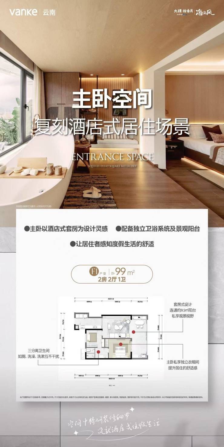 万科·大理·拾叁月,建面约99㎡F1户型推荐,主卧以酒店式套房为设计灵感,配套独立卫浴系统及景观阳台,让居住者感知度假生活的舒适!关注万科·大理·拾叁月的朋友可前往售楼处现场看房,咨询房源信息请拨打电话4001560036