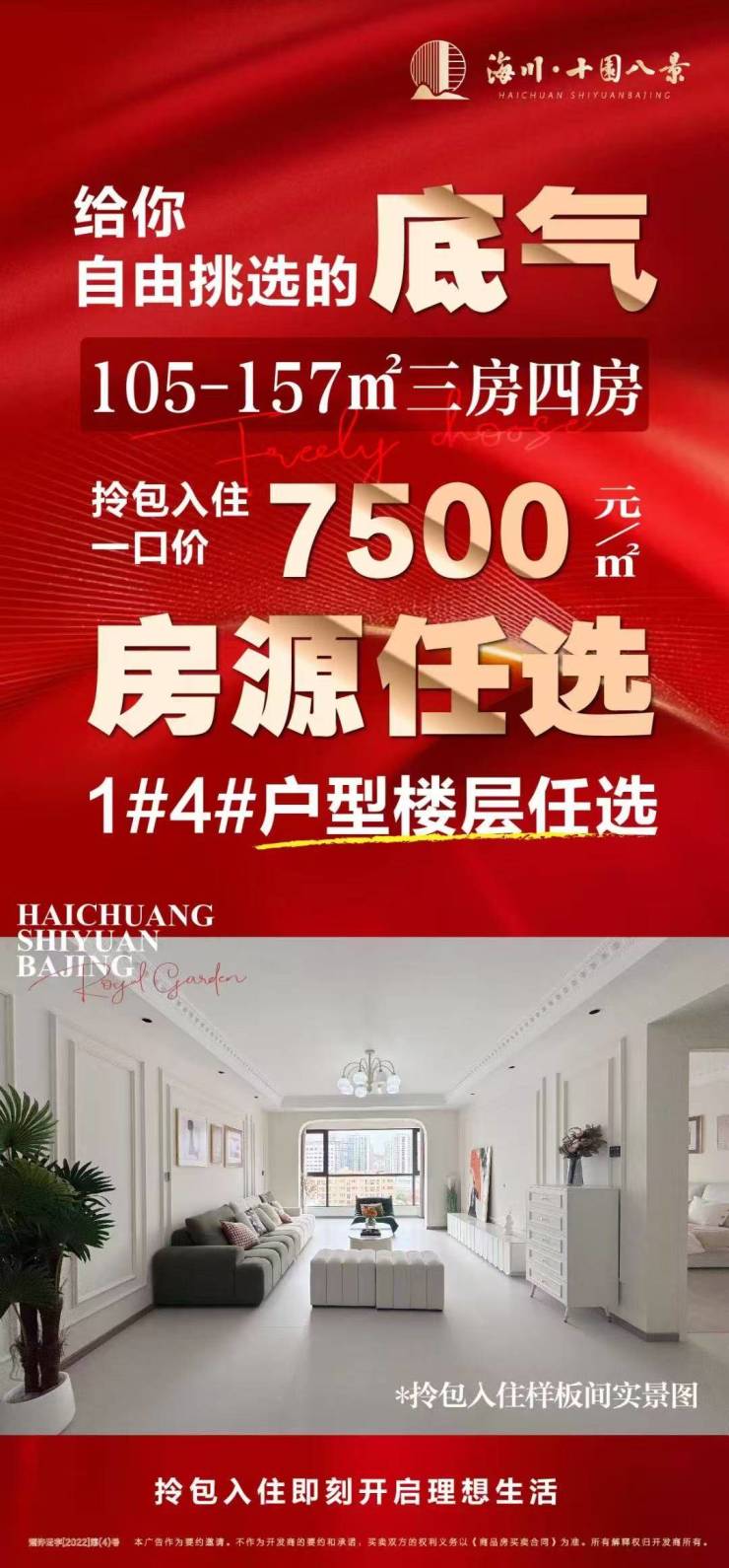 海川·十园八景,建面约105-157㎡三房四房,拎包入住一口价约7500元/㎡起!关注海川·十园八景的朋友可前往售楼处现场看房,咨询房源信息请拨打电话400-156-0036 转 426610!