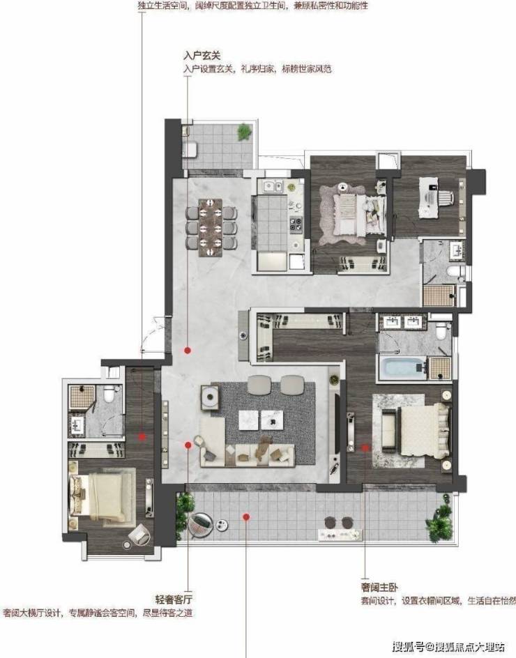 户型亮点:动静分区合理布局+约10.4米揽景阳台+独立入户玄关+双套房设计