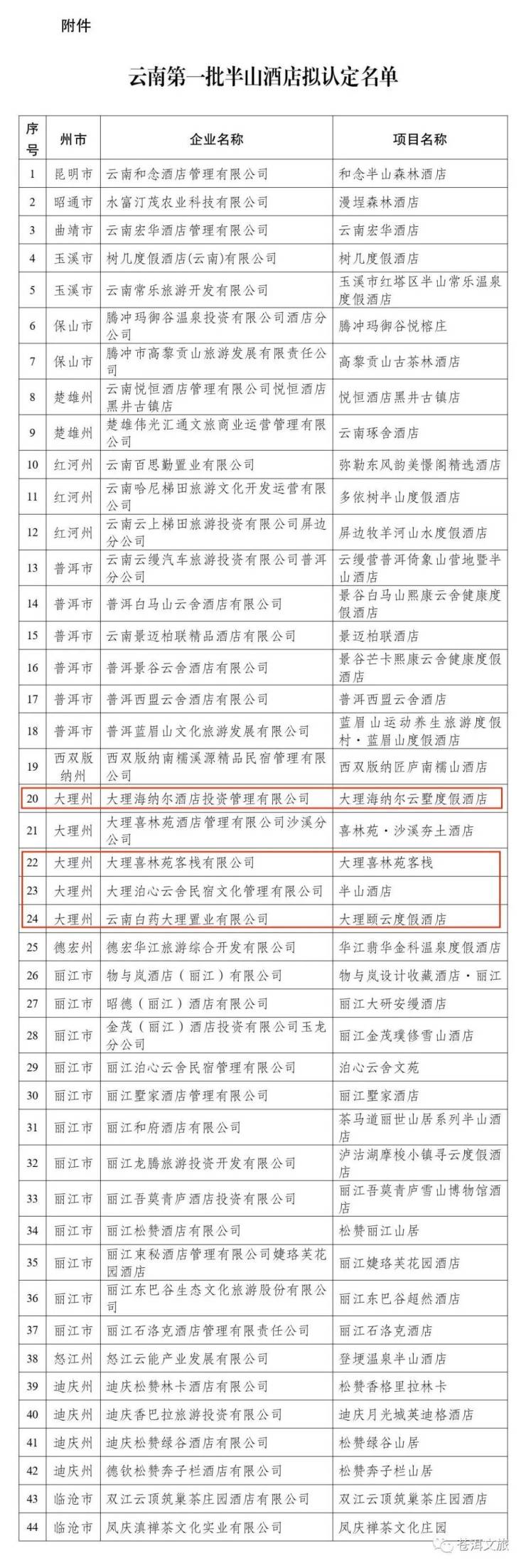 为推动全省旅游住宿设施品质化、特色化发展,省文化和旅游厅组织开展了云南半山酒店评选,经业主申报、县区市推荐、州市初评、省级评审,形成拟认定的云南第一批半山酒店名单。现将云缦营普洱倚象山营地暨半山酒店等44家半山酒店拟认定名单(详见附件)予以公示。