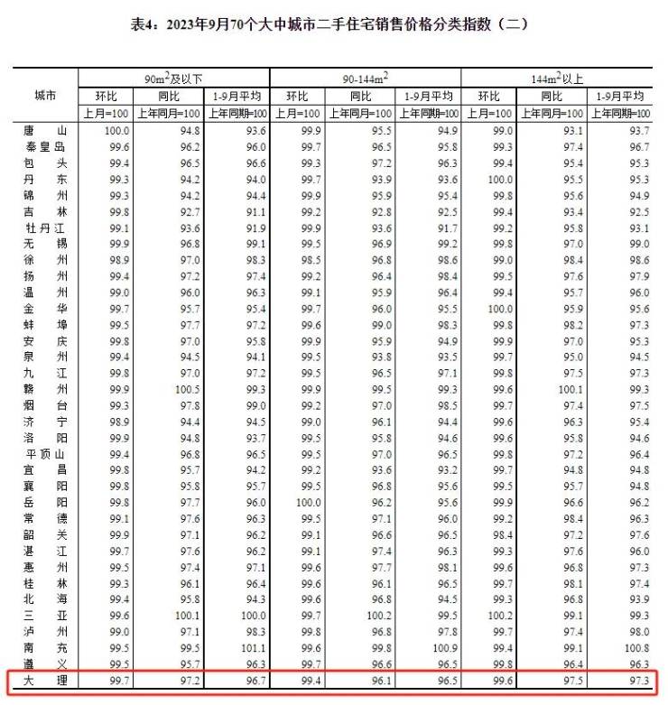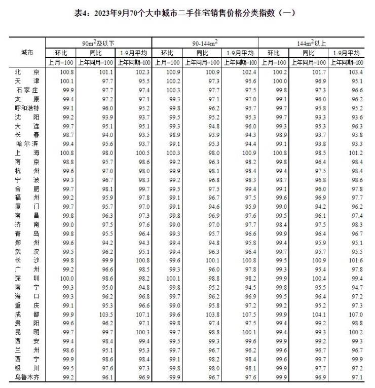 90-144㎡二手住宅销售价格环比下跌0.6%,同比下跌3.9%;