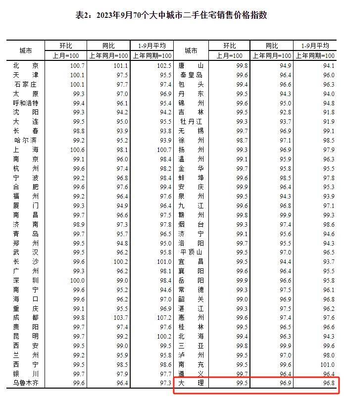 根据发布的数据来看,2023年9月份大理市新建商品住宅销售价格环比上涨0.2%,同比下跌2.6%;2023年9月份大理市二手住宅销售价格环比下跌0.5%,同比下跌3.1%。