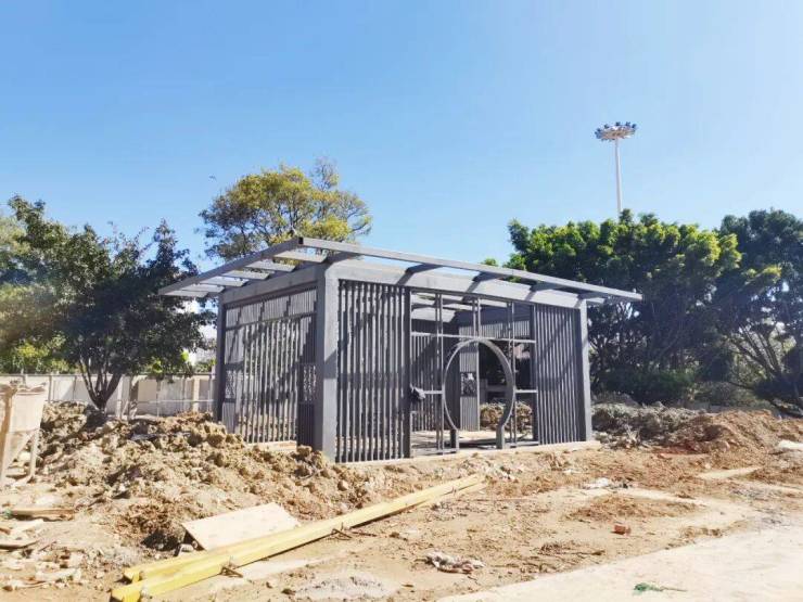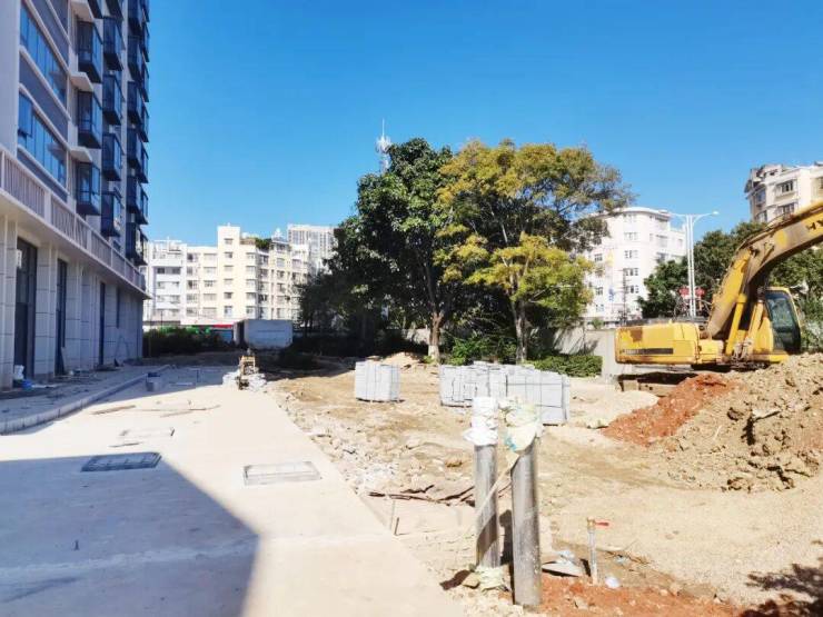 【一期附属工程】 一期附属工程土建工程基本完工,一期花园、凉亭、花台等园林设施正在施工中。