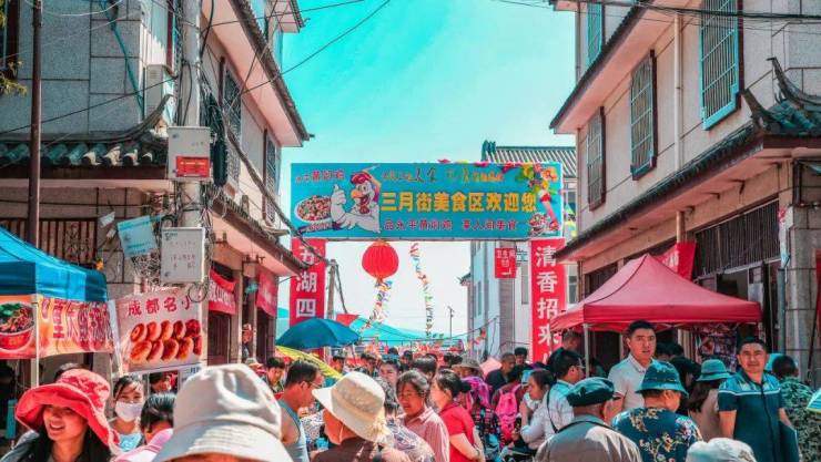 “乌绫帕子凤头鞋,结队相携赶月街。观音石畔烧香去,元祖碑前买货来。”正如清代乾隆大理举人师范在《月街吟》中描写的大理三月街盛况,作为传承千年的民族传统盛会,大理三月街,号称“千年赶一街,一街赶千年”,它既是云南西部古老而繁荣的贸易集市,也是大理州一年一度的民间文艺体育交流节日。