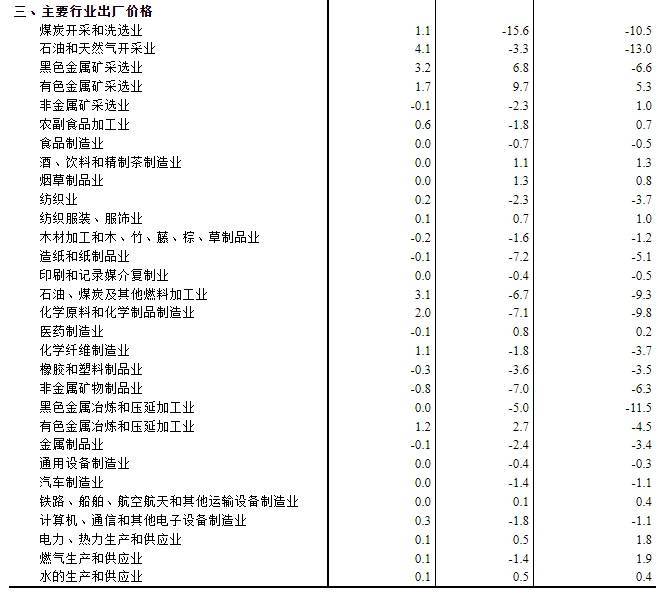 工业生产者出厂价格中,生产资料价格下降3.0%,影响工业生产者出厂价格总水平下降约2.45个百分点。其中,采掘工业价格下降7.4%,原材料工业和加工工业价格均下降2.8%。生活资料价格下降0.3%,影响工业生产者出厂价格总水平下降约0.07个百分点。其中,食品价格下降0.3%,衣着价格上涨0.8%,一般日用品价格上涨0.7%,耐用消费品价格下降1.2%。